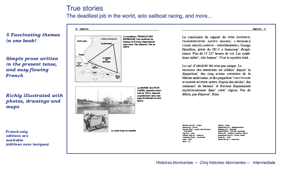 We have been publishing easy French readers and audiobooks for the second language learner since 1970. Our books reflect a variety of themes and styles, and are written in simple, easy-flowing French, using everyday vocabulary and expressions. Aquila readers are not translations or adaptations: They are original, authentic, age and level-appropriate texts especially written for the young reader of French as a second language. Most of our books are written in dialogue format and will amuse readers with short, humorous stories in everyday situations: School, family, sports, ordering meals, friends, winter holidays, shopping, the environment, anti-bullying, racism, media literacy and many more familiar, everyday themes children, young adults and teenagers can relate to. Books contain an exhaustive French-English vocabulary (optional) and a multitude of activities for comprehension, vocabulary and easy grammar. Our audiobooks – and new audio-visual e-books which feature highlighted read-along text – have been recorded by professional actors playing the roles of the characters in the stories. These audiobooks are A great way to reinforce both reading and listening comprehension. We have hundreds of readers and audiobooks for many reading levels. We invite you to explore our website to read and listen to audio excerpts. Call us direct at 1-800-667-7071 and we will be glad to guide you through our many reading programs. Below is a quick glimpse of the different styles, formats and levels available in our catalogue. Bonne lecture!